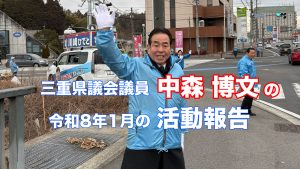2026年2月28日 / 最終更新日時 : 2026年2月28日 小林 まさる 活動記録 三重県議会議員中森博文令和8年2月の活動報告 三重県議会議員中森博文、令和8年1月の活動報告です! 1月5日に高市総理が伊勢神宮に参拝されるとの事でお出迎えとご同行をさせて頂きました! また1月27日より衆院選が始まり、後半はほぼ選挙一色でした! 私の地元名張市は三重2区であり、川崎ひでと候補が引き続き国で働いて頂けるよう全力で動いているところです!